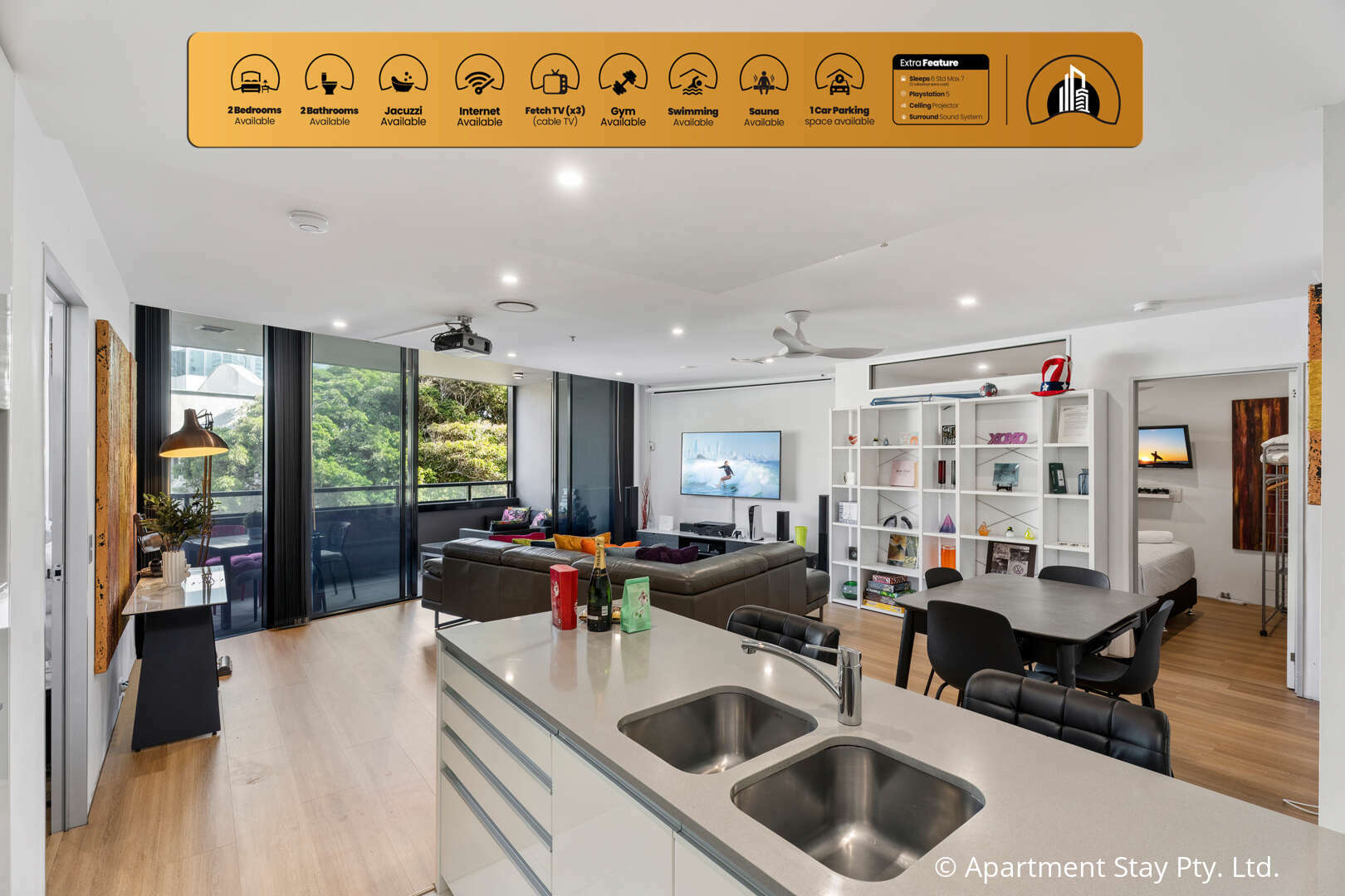 Entertainment paradise with a large projector screen that streams Foxtel, PS4 and Xbox included in the apartment! Both rooms has its separate Foxtel and the spa bath is next level! FREE UNLIMITED WIFI!!!! Not an easy find in Surfers!!! Woolworths downstairs (literally!) Access to the 3 pools, games room, larger than most gyms and steam room is too good with the sauna is game over! This place has it all and with Peter as your PERFECT Host, communication within seconds with answers to all your questions. Tried booking for Christmas but no surprise it’s already booked. Thank you Peter beautiful apartment and your service is on point 100%!!!